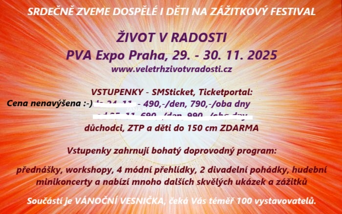 Srdečně Vás zveme dospělé i děti na 1. ročník největšího prodejního a zážitkového festivalu "ŽIVOT V RADOSTI". Součástí festivalu je VÁNOČNÍ VESNIČKA a bohatý doprovodný program.